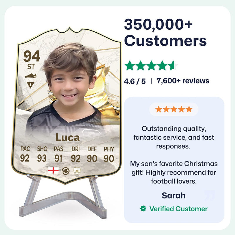 Yes! Our football card designers will remove the background from the photo you upload so it looks just like the football cards you might’ve seen games like EA FC 25, EA FC 24 or FIFA. We’ll also position the photo perfectly on the football card so it looks great. If there are any problems with the quality of your photo, we’ll reach out and let you know. Plus, our website's AI will remove the background on the image for visual purposes before purchase so you can see it without a background on the card.