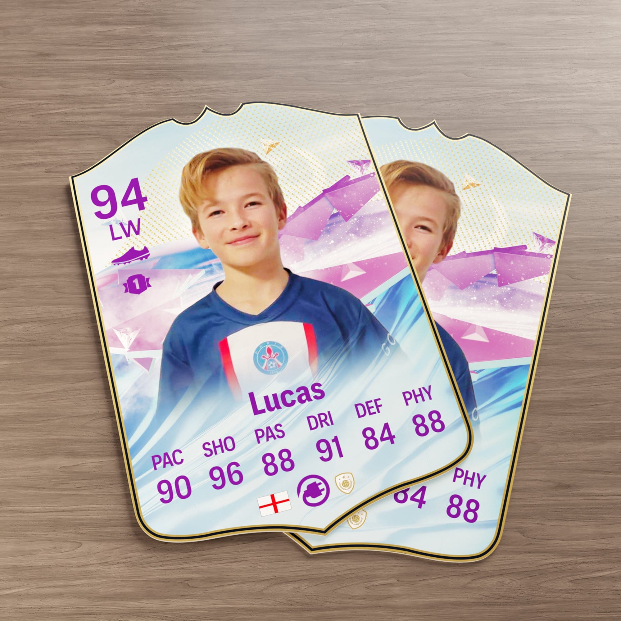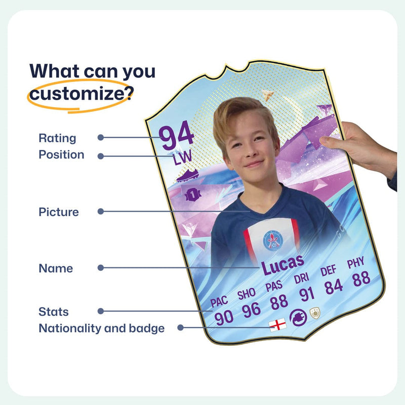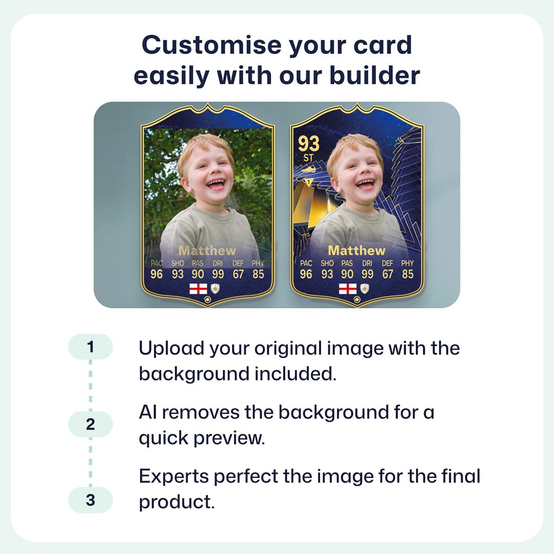 When it comes to personalising your card, the basic steps are to upload a photo and add a name to your card. Then you’ll add details like your player’s position and skill ratings out of 99 for each football skill shown on the card. Our online card builder makes this really easy. And if you aren’t a football card expert, don’t worry!