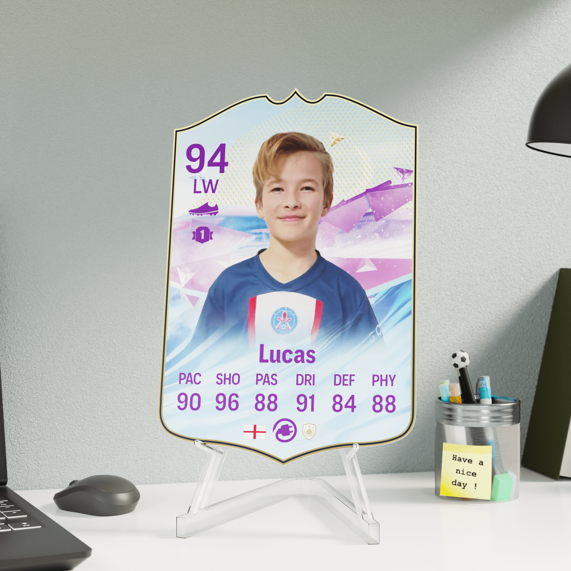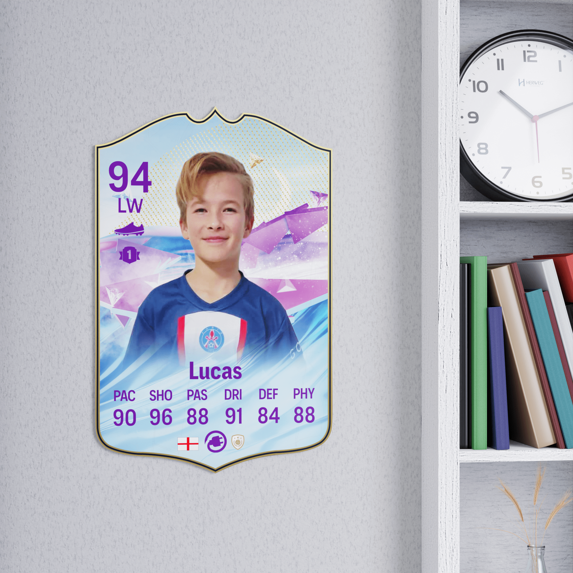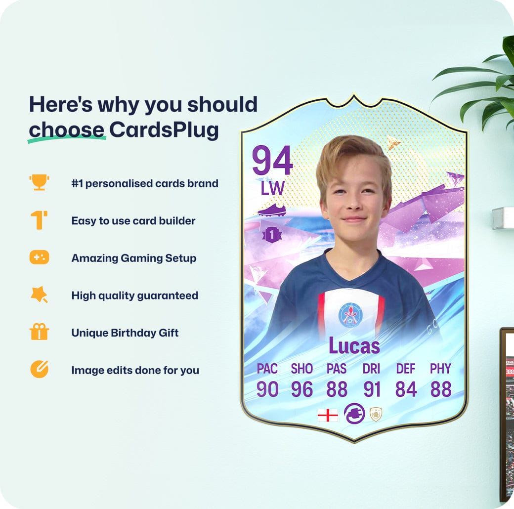 When it comes to personalising your card, the basic steps are to upload a photo and add a name to your card. Then you’ll add details like your player’s position and skill ratings out of 99 for each football skill shown on the card. Our online card builder makes this really easy. And if you aren’t a football card expert, don’t worry!
