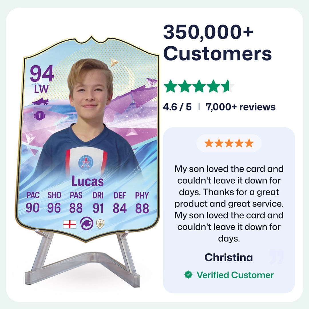 Once you’ve personalised your card, our design experts will edit your photo, design your card, and bring it to life in stunning quality. You’ll get a full preview before we print your card and every card’s quality is backed by our Gold Standard Guarantee. So far, over 350,000+ football fans agree: A CardsPlug football card is the ultimate football gift!
