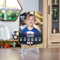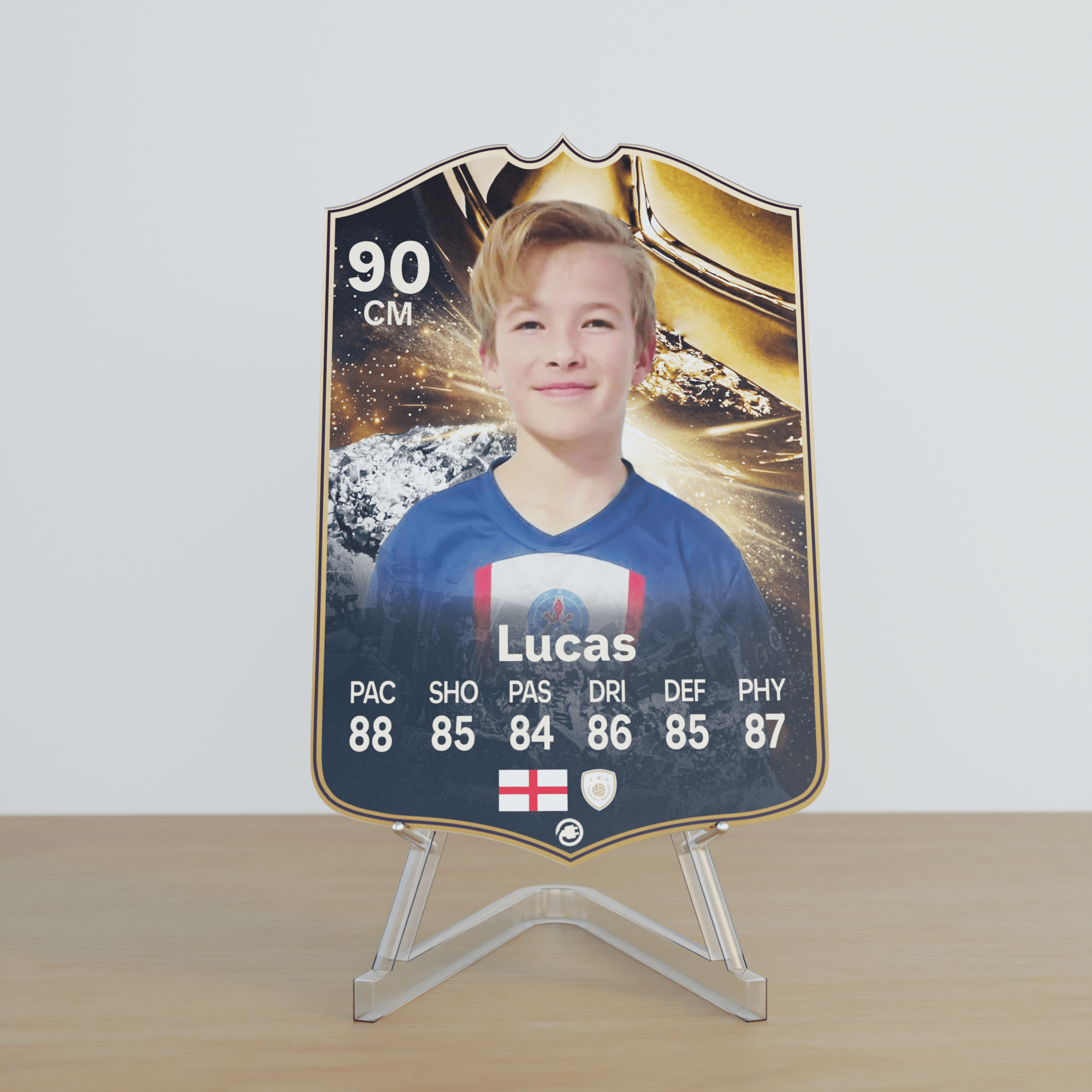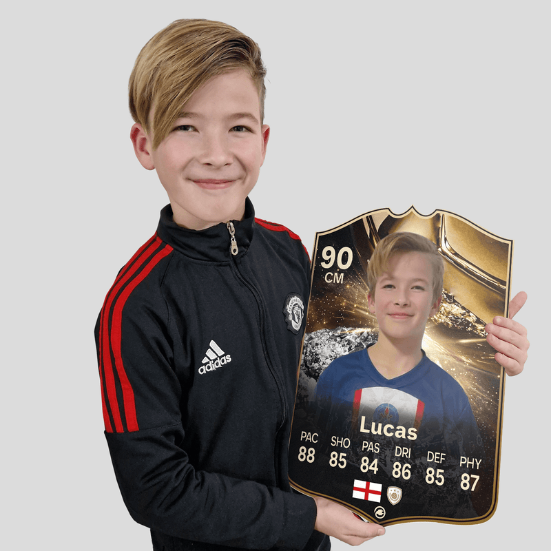 When it comes to personalising your card, the basic steps are to upload a photo and add a name to your card. Then you’ll add details like your player’s position and skill ratings out of 99 for each football skill shown on the card. Our online card builder makes this really easy. And if you aren’t a football card expert, don’t worry!