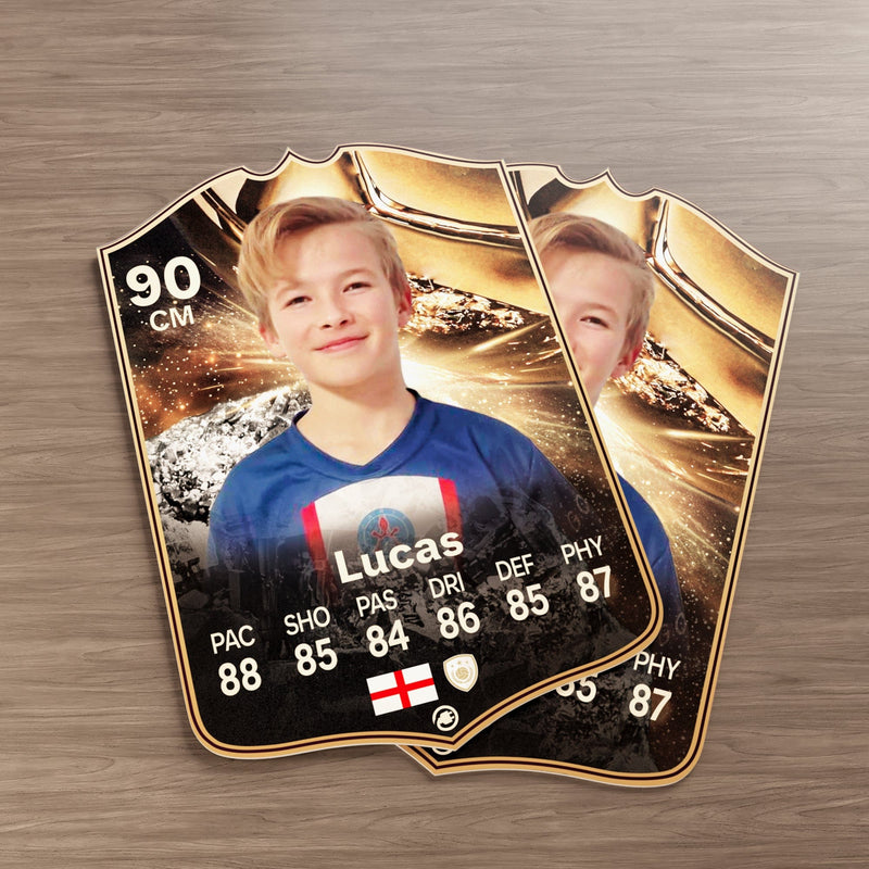 Our football card builder lets you choose between two different card materials. Our Standard cards are made of a ultra-strong variety of Foamex (not cardboard or foam!). This material has a lovely gloss finish and is also super durable. Our world-exclusive Metal football cards have a matte finish and are slightly heavier. Both look amazing and will last forever.