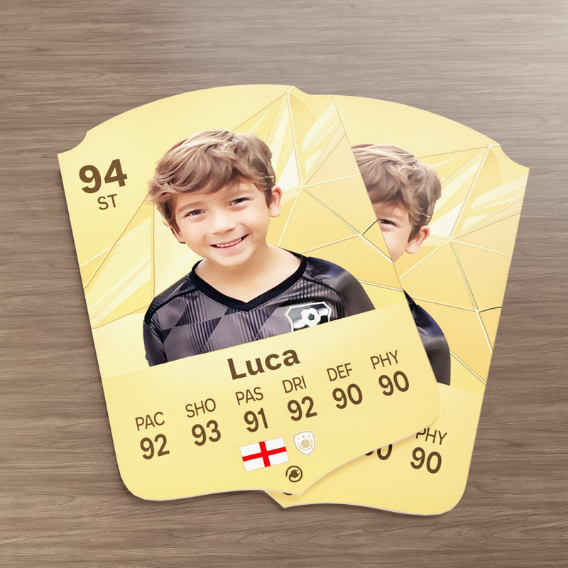 When it comes to personalising your card, the basic steps are to upload a photo and add a name to your card. Then you’ll add details like your player’s position and skill ratings out of 99 for each football skill shown on the card. Our online card builder makes this really easy. And if you aren’t a football card expert, don’t worry!