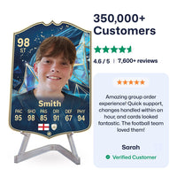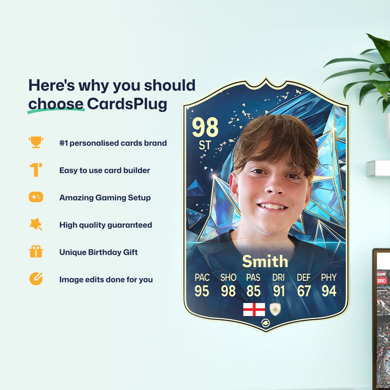 CardsPlug is home to the world’s favourite personalised football cards. Our easy football card builder lets you make a real life football card with your own name, photo, and skill ratings. With 100+ designs to choose from and some inspired by EA SPORTS FC 26 cards seen in EA FC 26, EA FC 25 and FC 24 as well as FIFA cards seen in games like FIFA 23 and FIFA 22.