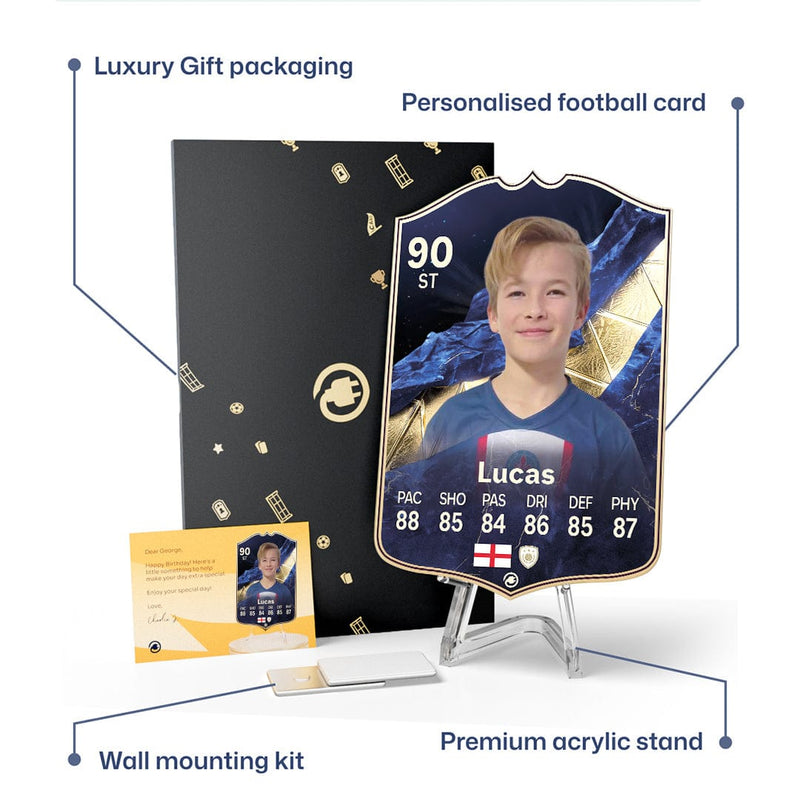 When it comes to personalising your card, the basic steps are to upload a photo and add a name to your card. Then you’ll add details like your player’s position and skill ratings out of 99 for each football skill shown on the card. Our online card builder makes this really easy. And if you aren’t a football card expert, don’t worry!