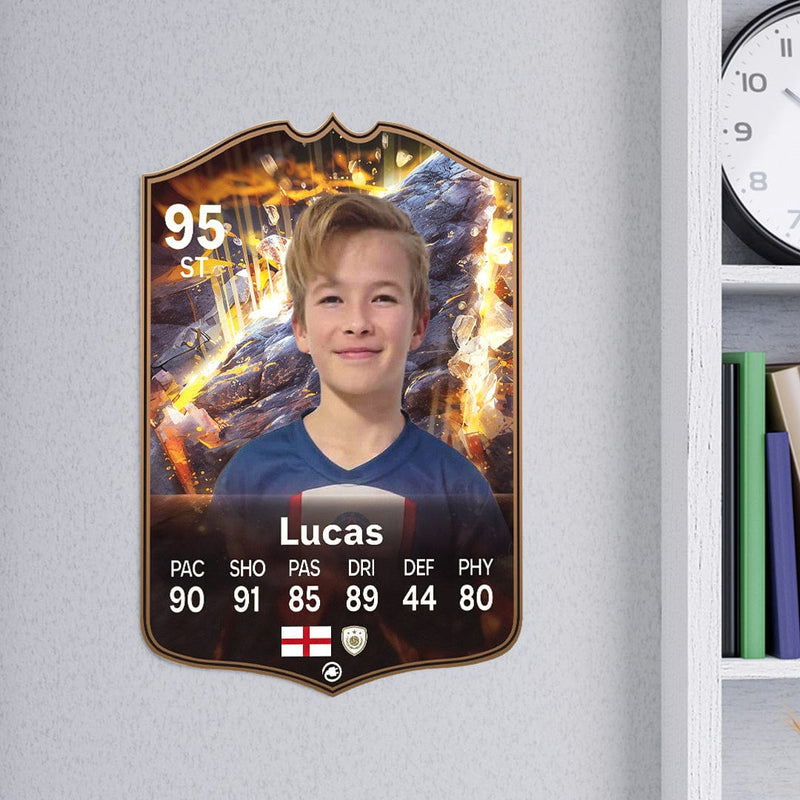 Our football card builder lets you choose between two different card materials. Our Standard cards are made of a ultra-strong variety of Foamex (not cardboard or foam!). This material has a lovely gloss finish and is also super durable. Our world-exclusive Metal football cards have a matte finish and are slightly heavier. Both look amazing and will last forever.