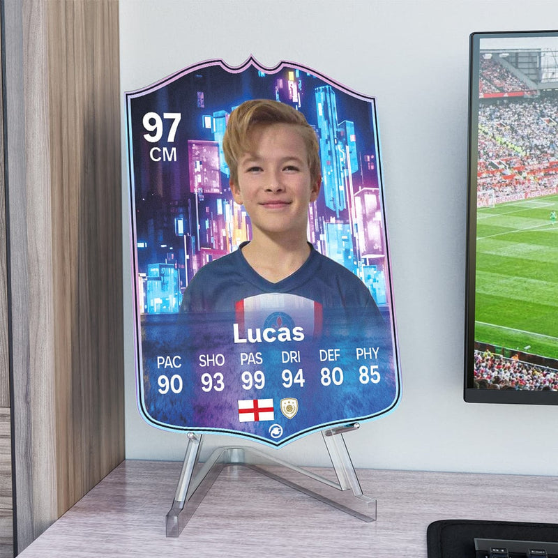 When it comes to personalising your card, the basic steps are to upload a photo and add a name to your card. Then you’ll add details like your player’s position and skill ratings out of 99 for each football skill shown on the card. Our online card builder makes this really easy. And if you aren’t a football card expert, don’t worry!