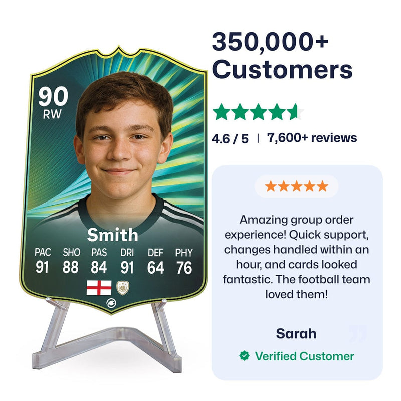 Once you’ve personalised your card, our design experts will edit your photo, design your card, and bring it to life in stunning quality. You’ll get a full preview before we print your card and every card’s quality is backed by our Gold Standard Guarantee. So far, over 350,000+ football fans agree: A CardsPlug football card is the ultimate football gift!