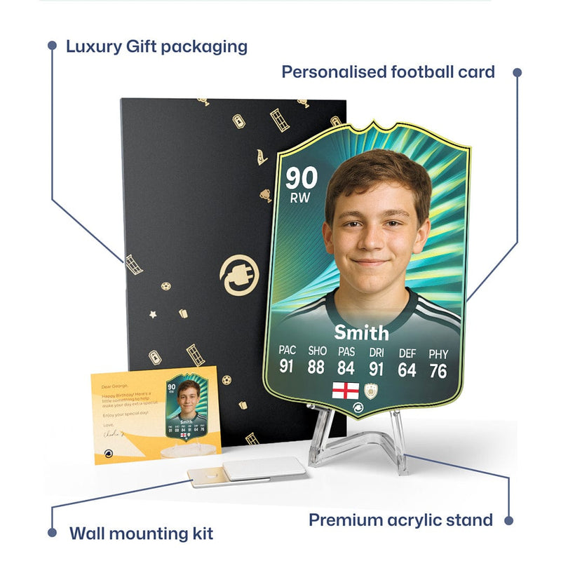When it comes to personalising your card, the basic steps are to upload a photo and add a name to your card. Then you’ll add details like your player’s position and skill ratings out of 99 for each football skill shown on the card. Our online card builder makes this really easy. And if you aren’t a football card expert, don’t worry!