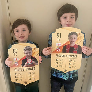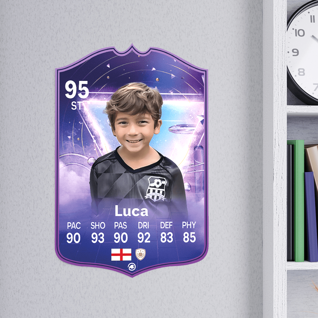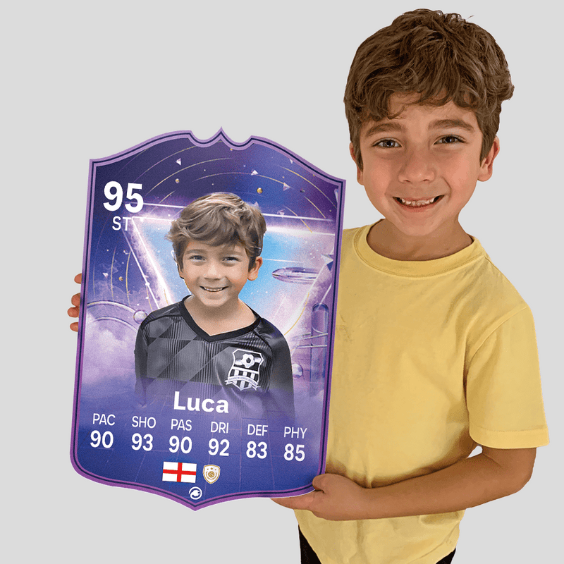 When it comes to personalising your card, the basic steps are to upload a photo and add a name to your card. Then you’ll add details like your player’s position and skill ratings out of 99 for each football skill shown on the card. Our online card builder makes this really easy. And if you aren’t a football card expert, don’t worry!