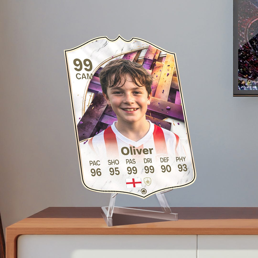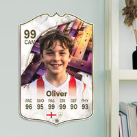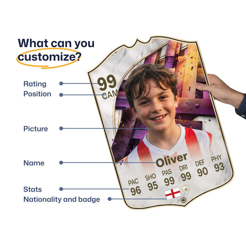 When it comes to personalising your card, the basic steps are to upload a photo and add a name to your card. Then you’ll add details like your player’s position and skill ratings out of 99 for each football skill shown on the card. Our online card builder makes this really easy. And if you aren’t a football card expert, don’t worry!