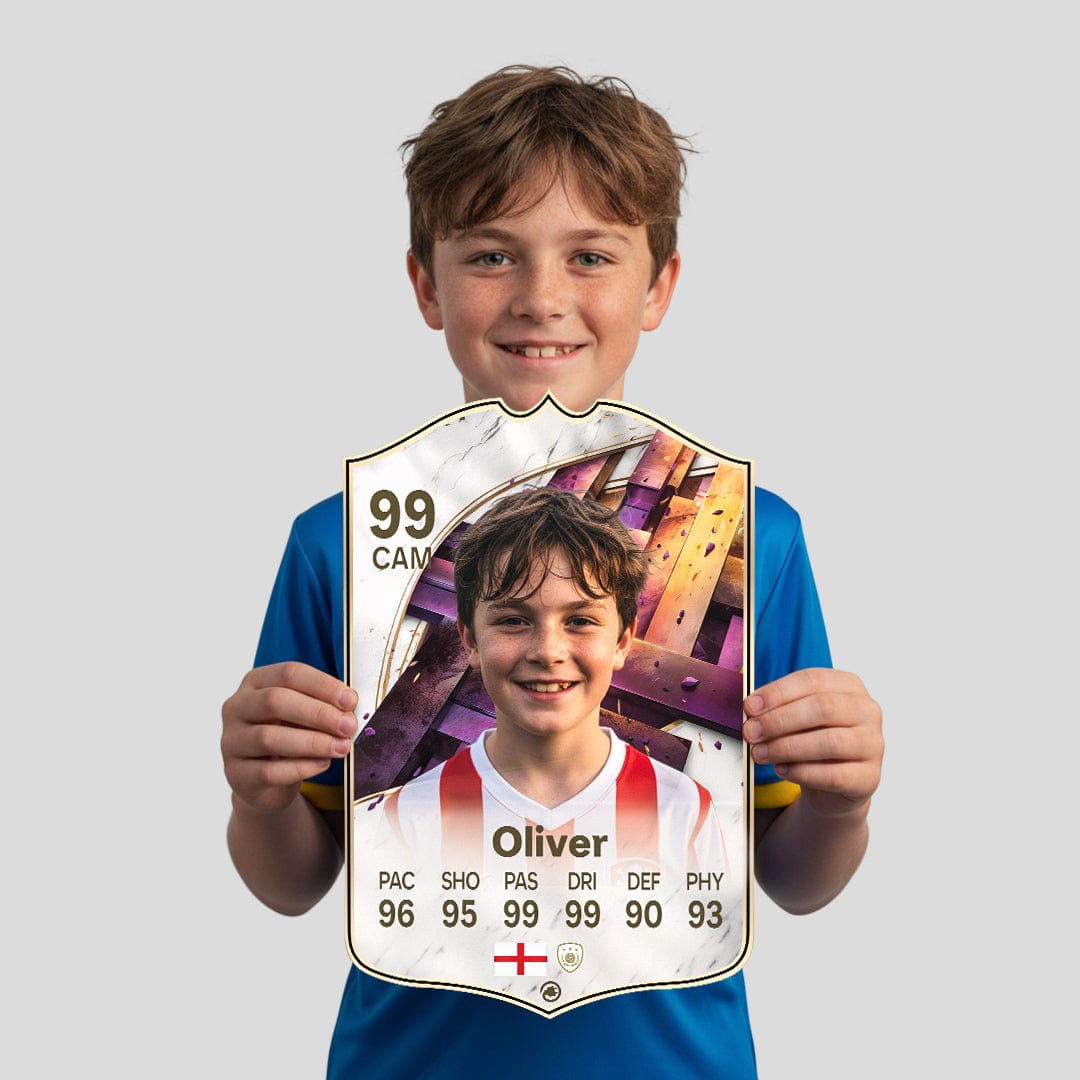Our football card builder lets you choose between two different card materials. Our Standard cards are made of a ultra-strong variety of Foamex (not cardboard or foam!). This material has a lovely gloss finish and is also super durable. Our world-exclusive Metal football cards have a matte finish and are slightly heavier. Both look amazing and will last forever.