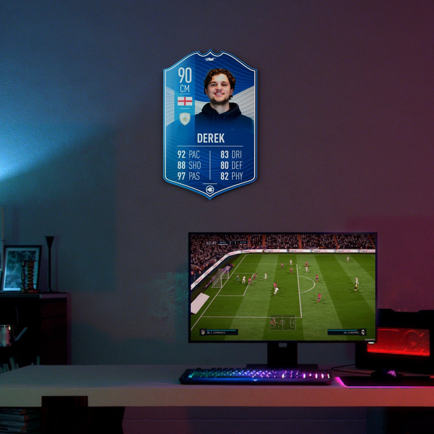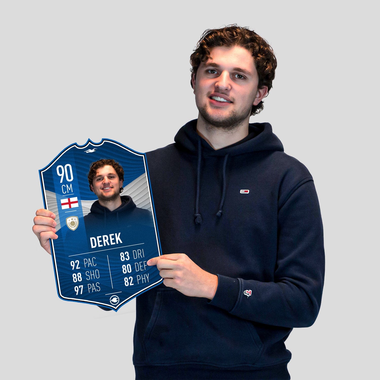 When it comes to personalising your card, the basic steps are to upload a photo and add a name to your card. Then you’ll add details like your player’s position and skill ratings out of 99 for each football skill shown on the card. Our online card builder makes this really easy. And if you aren’t a football card expert, don’t worry!